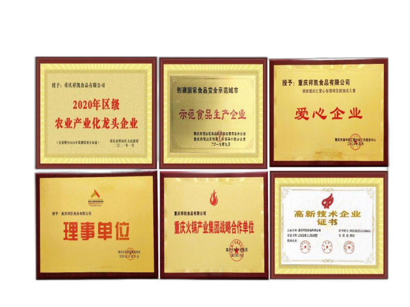 公司先后通過ISO三體系認(rèn)證,知識(shí)產(chǎn)權(quán)認(rèn)證,兩化融合A級(jí)認(rèn)證,有系統(tǒng)的多層次員工培訓(xùn)體系。2019年成為“示范食品生產(chǎn)企業(yè)”,2020-2023年被授予“區(qū)級(jí)農(nóng)業(yè)產(chǎn)業(yè)化龍頭企業(yè)”,2022年獲得高新技術(shù)企業(yè)(證書編號(hào)GR202251101662),是重慶江湖菜發(fā)展促進(jìn)會(huì)理事單位,重慶火鍋產(chǎn)業(yè)集團(tuán)副會(huì)長單位,也是重慶輕工職業(yè)學(xué)院共建單位,重慶食品工業(yè)研究所合作單位。
